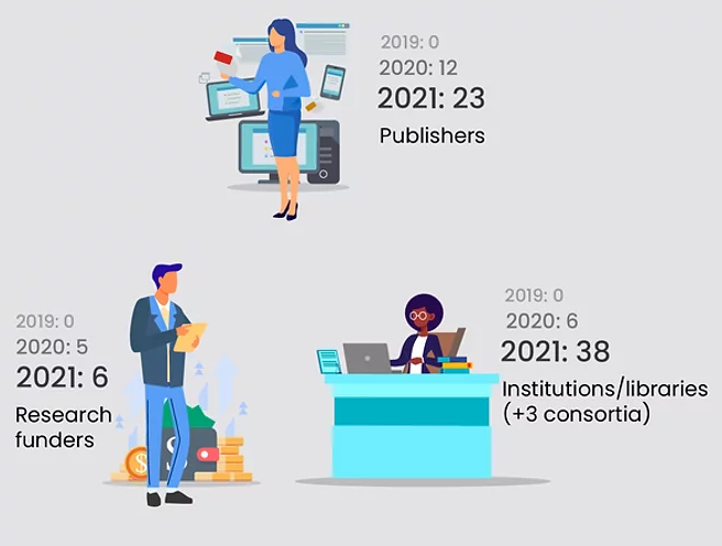 In line with the principles, the following bodies have been created in 2021: Client Advisory Board; Advisory Group (2022 members here); Working Groups. The Message Structure Working Group channels community feedback and input and prepares updates to the standardised messaging protocol. The China Working Groups has focused on market research, whereby our extended video animation was translated into Chinese and discussed with various research institutions. With more and more diamond initiatives finding their way to OA Switchboard, the Working Group on the topic has decreased meeting frequency, as did the Working Group on OA Books as a result of the 2022 focus. Our 'Generic Code' applies to each and every organisational body, meeting and initiative.